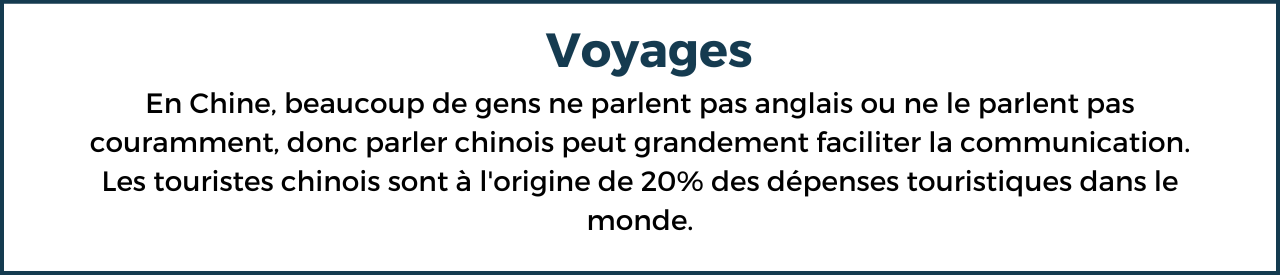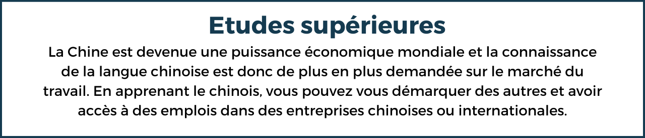 La Chine est devenue l’une des économies les plus importantes au monde, avec un marché de consommation énorme et une production massive d’exportation. Étudier le chinois peut donc offrir des opportunités de carrière dans les entreprises internationales, les organisations gouvernementales, les industries de la technologie et de la finance, et autres.